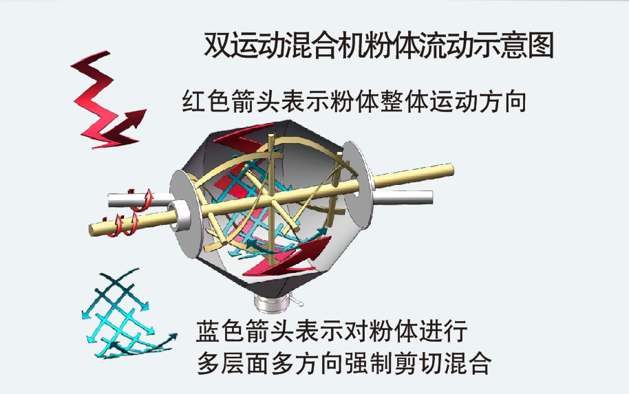 這也是因為兩個運動疊加混合的先進原理,在單位時間內兩個運動同時進行,不但雙倍地提高混合效率,還恰到好處地互相促進混合作用,促進混合工作更加有效地進行。