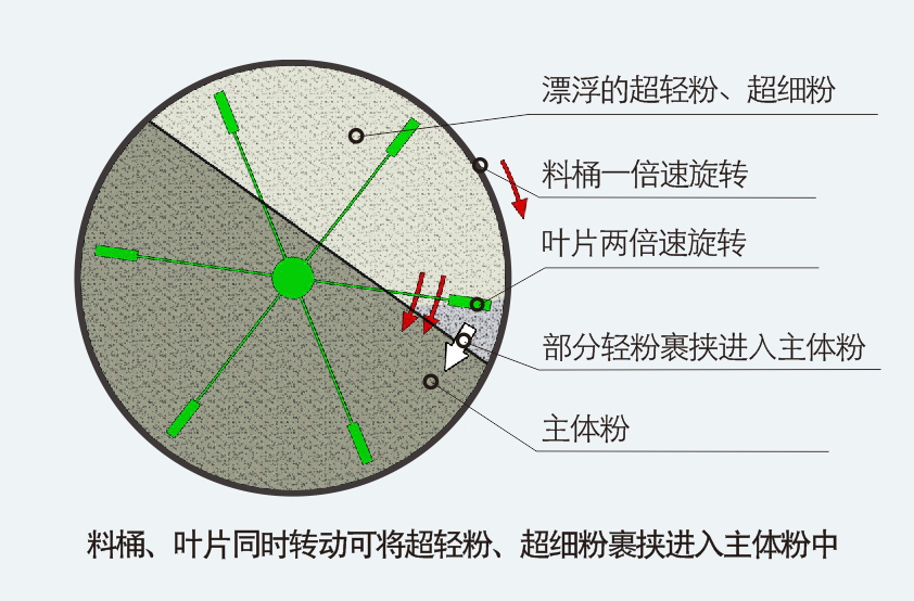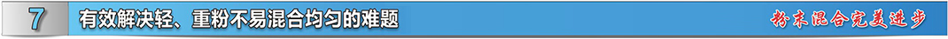 在傳統混合機中輕、重粉不易混合均勻是個典型的混合工藝難題。這是因為粉末在重力擴散混合中,因重量的差別較大,輕粉往往懸浮在主體粉之上,難以混入主體粉中,即使延長混合時間也難以解決問題。