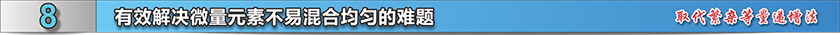 傳統混合機混合能力差,制約了微量元素的均勻混合,所以常采用人工等量分批分步投料的復雜混合方法來克服設備缺陷、達到微量元素均勻混合的目的。而雙運動疊加混合的優秀混合能力可以一次性完全將微量元素徹底混合均勻。省時、省工,均勻可靠不易出錯。